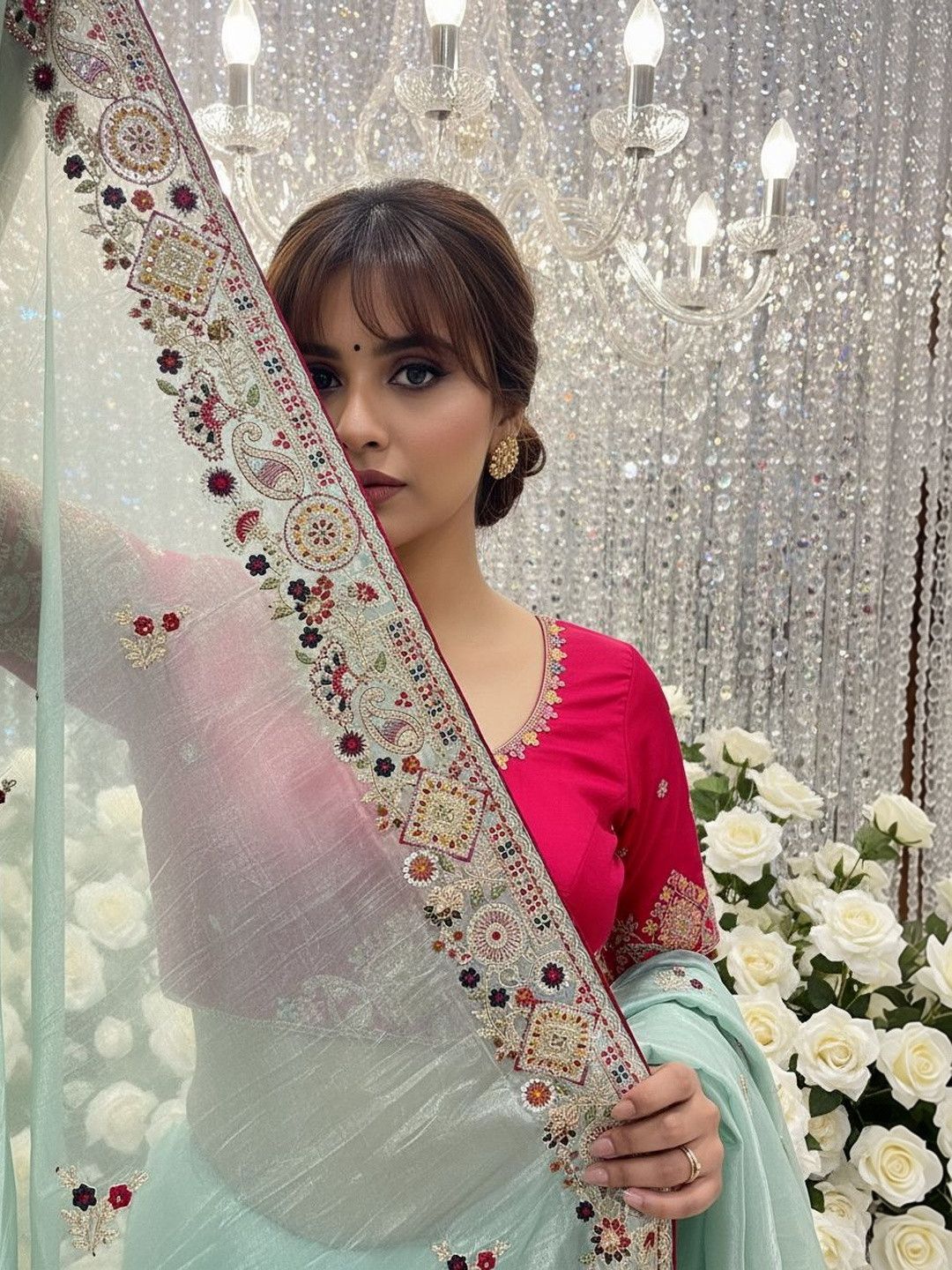 Premium Gold Crush Sequin Embroidery Saree with Contrast Blouse – Elegant Occasion Wear